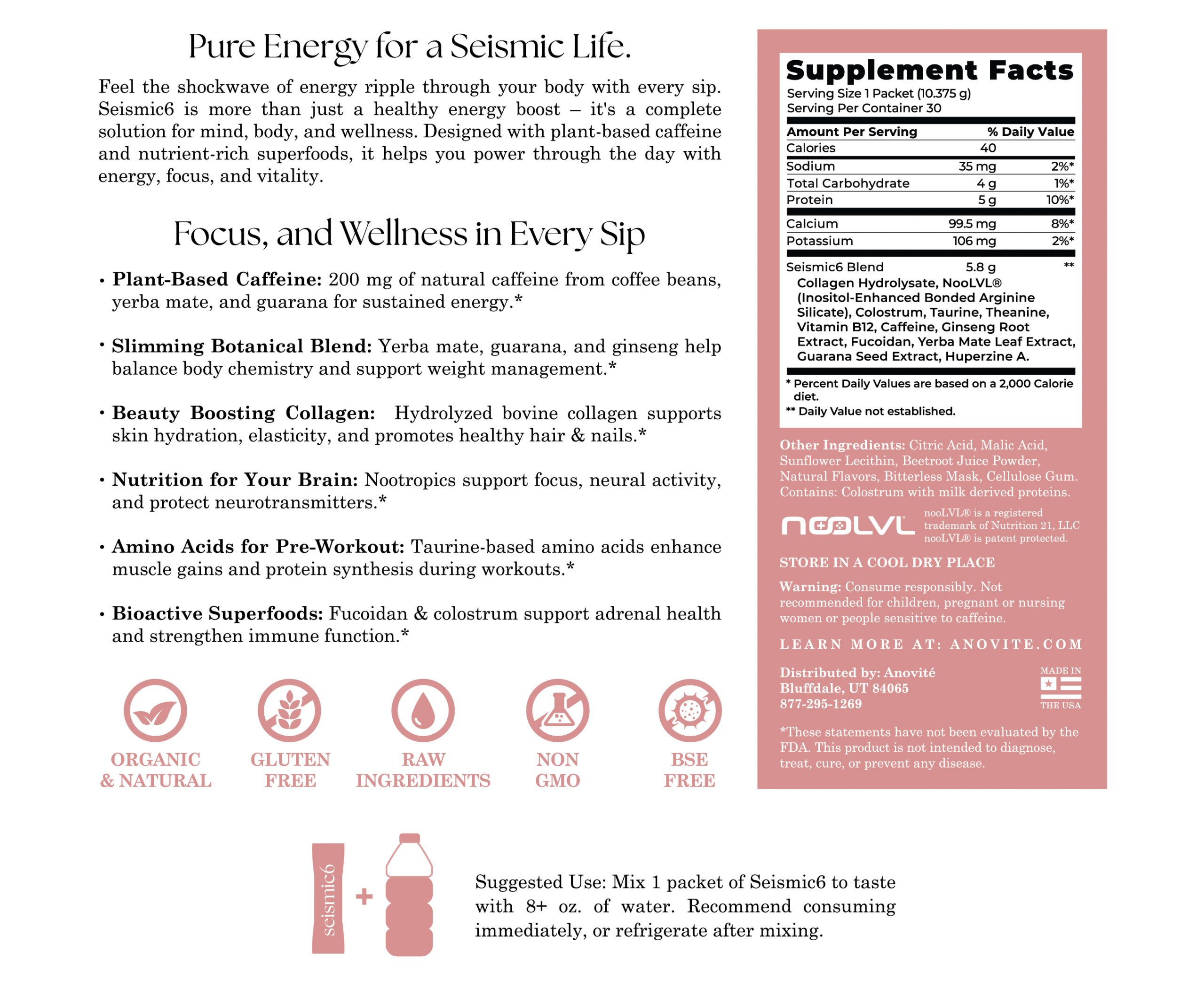 Energy shouldn't come with a crash—or a compromise. Seismic6 delivers a wave of clean, sustained vitality through a powerful fusion of amino acids, adaptogens, collagen, and nootropics. The metabolic support blend helps your body generate energy efficiently, while colostrum6 brings immune and recovery benefits. It’s not just fuel—it's foundational wellness in motion. Ride the wave.